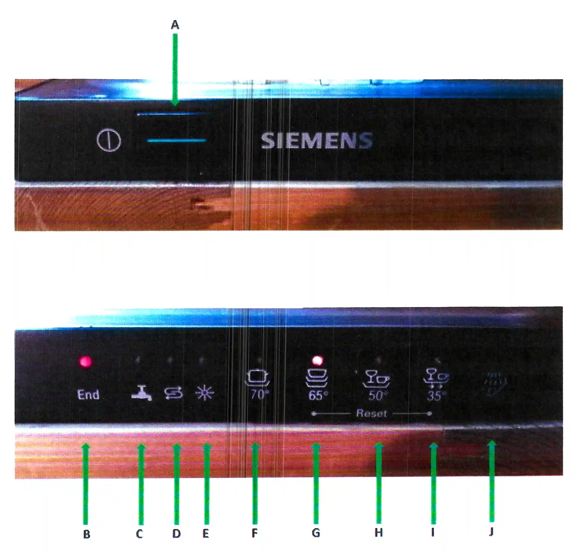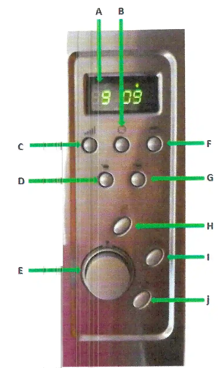 A – Power button. Once programme is selected, press this button. If you open the door mid-cycle, press this button before re-closing the door and the programme will commence again after a few seconds. If you want to completely reset or abandon a programme, press buttons G and I simultaneously for approximately 3 seconds. The programme will continue to run for a further minute, then will end.