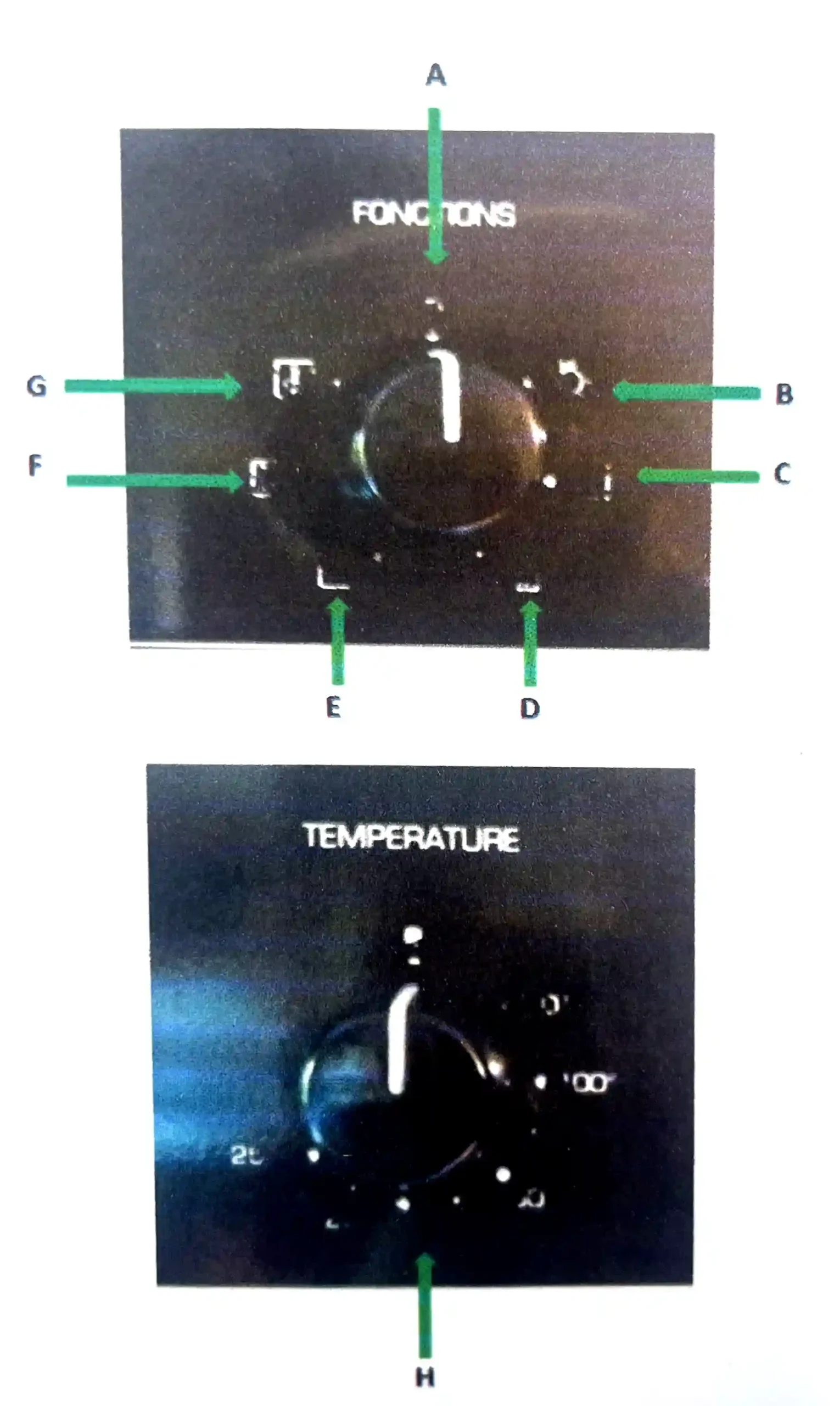 H = Use to select the cooking temperature of the oven. During heating the red thermostat light (far right) stays on and will turn off once chosen temperature has been reach.